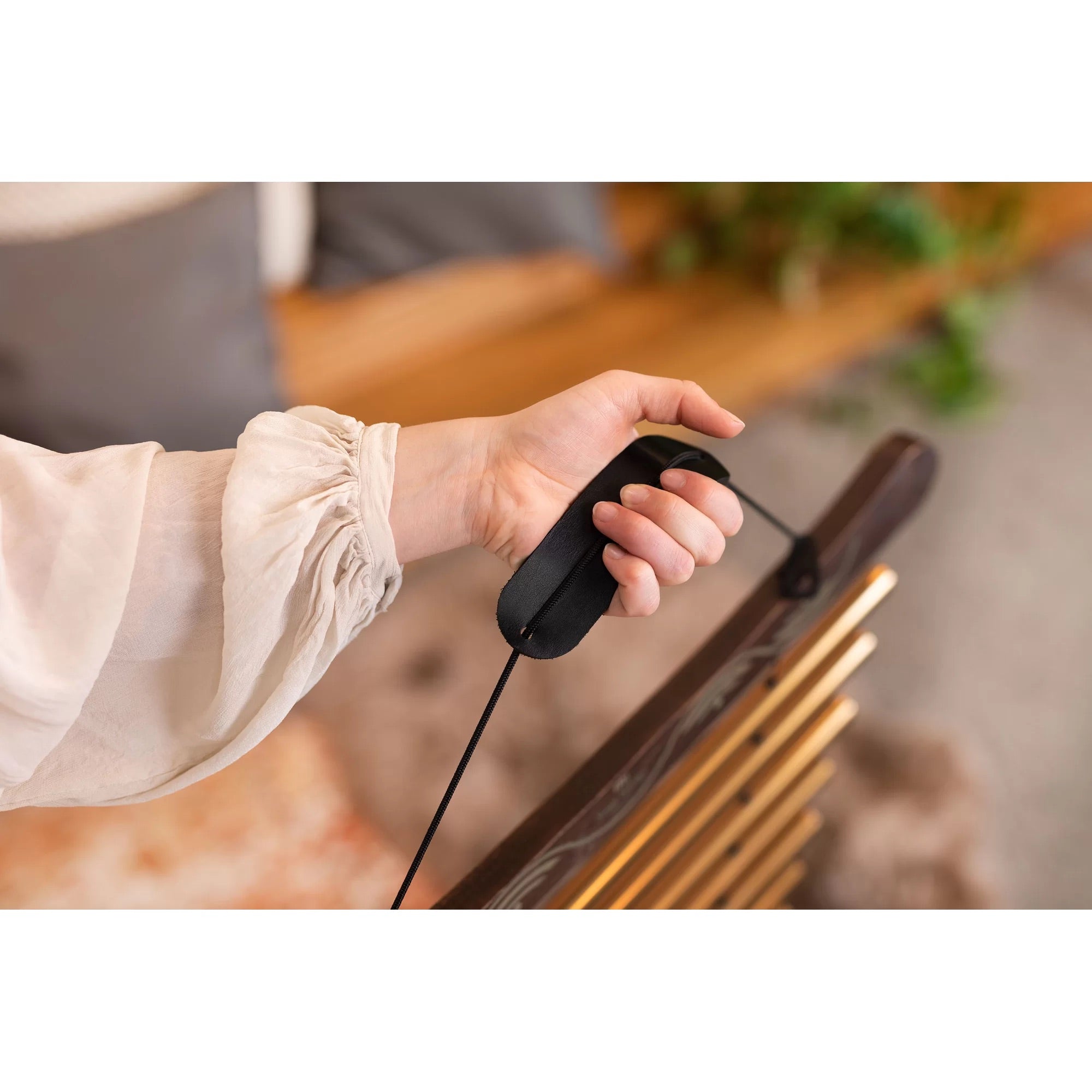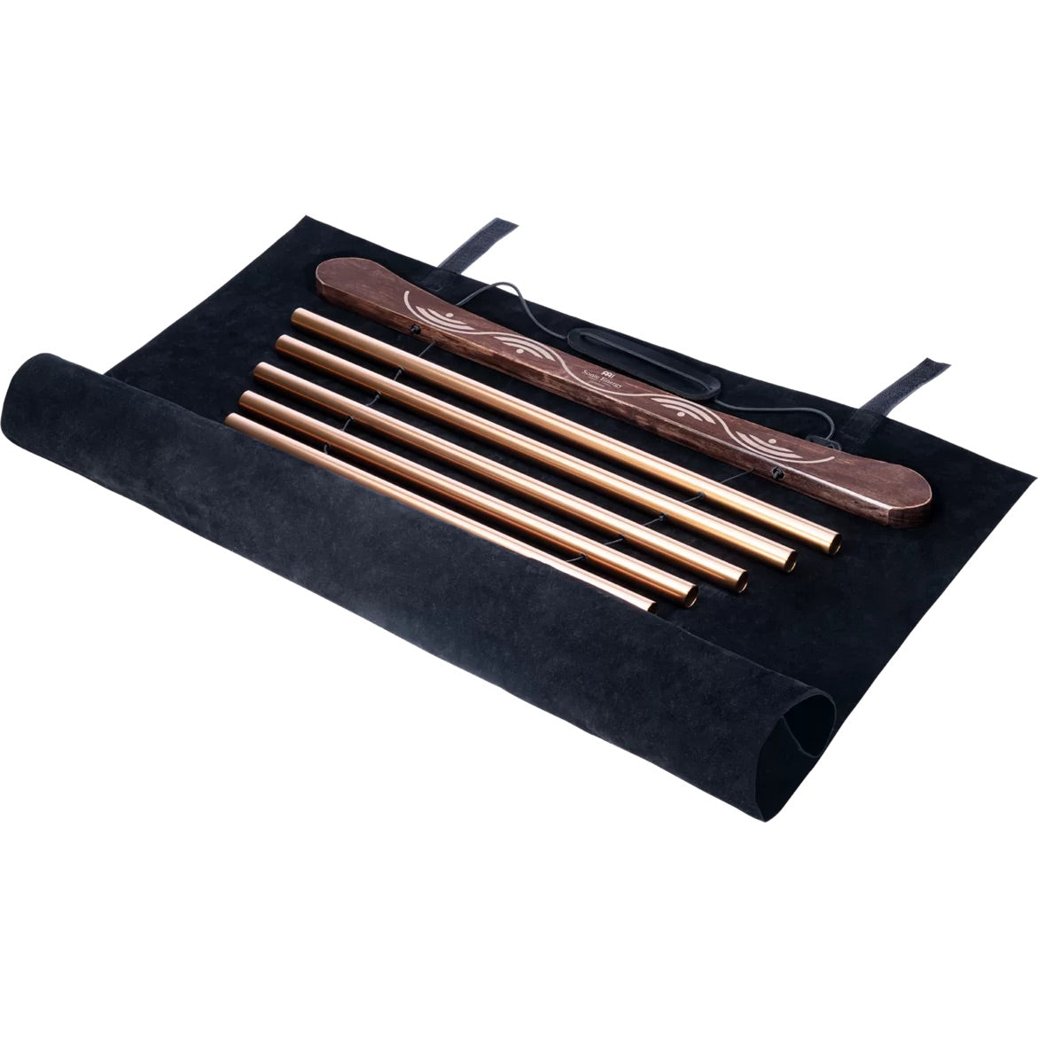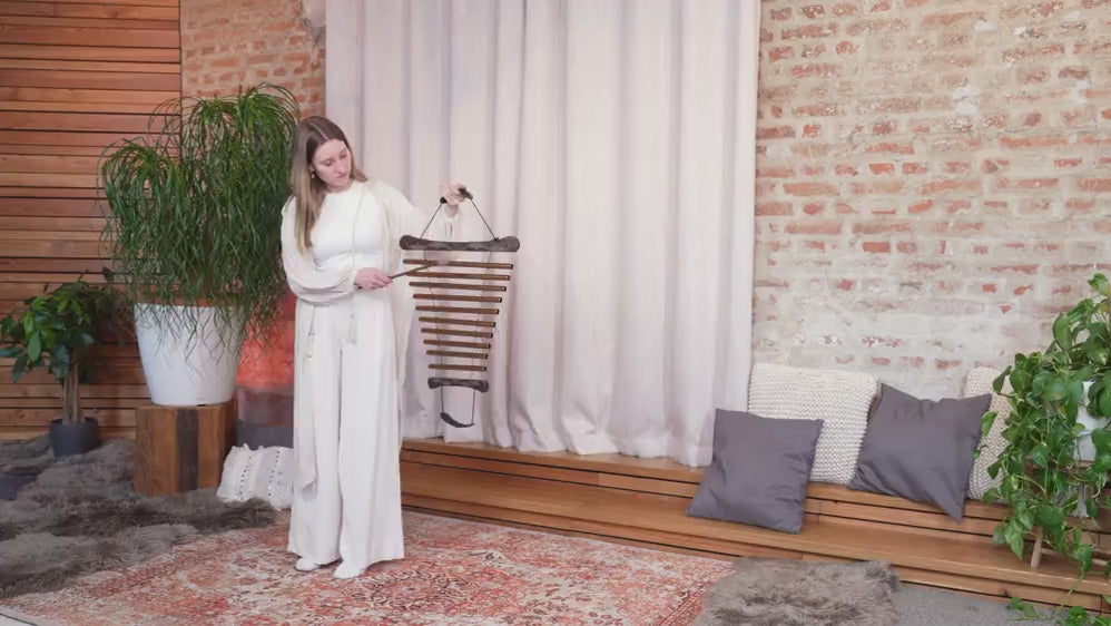 The sound tubes hang on sturdy nylon cords, centered in two ash wood holders. The tubes are made of corrosion-resistant aluminum and can be played separately or together.