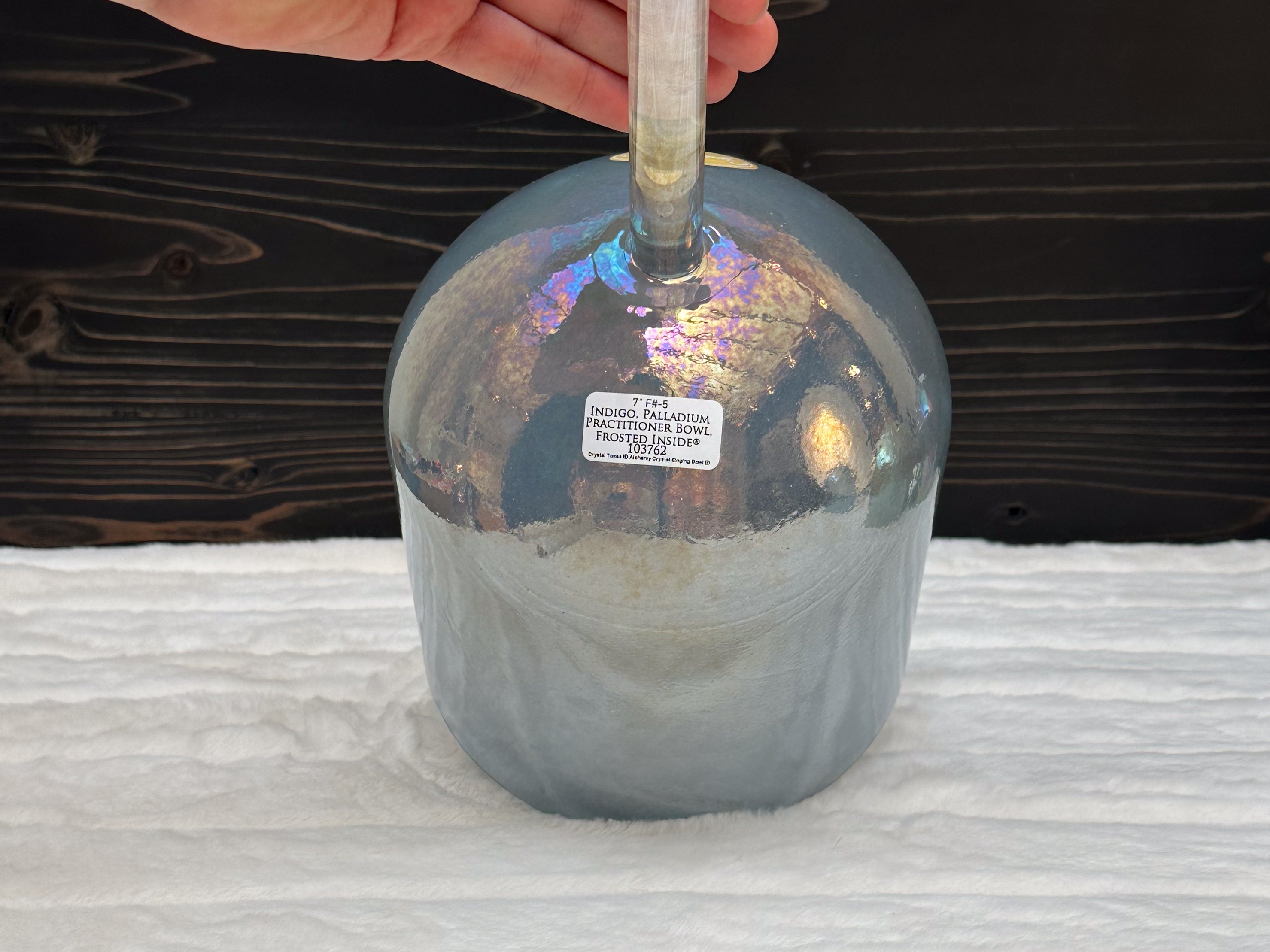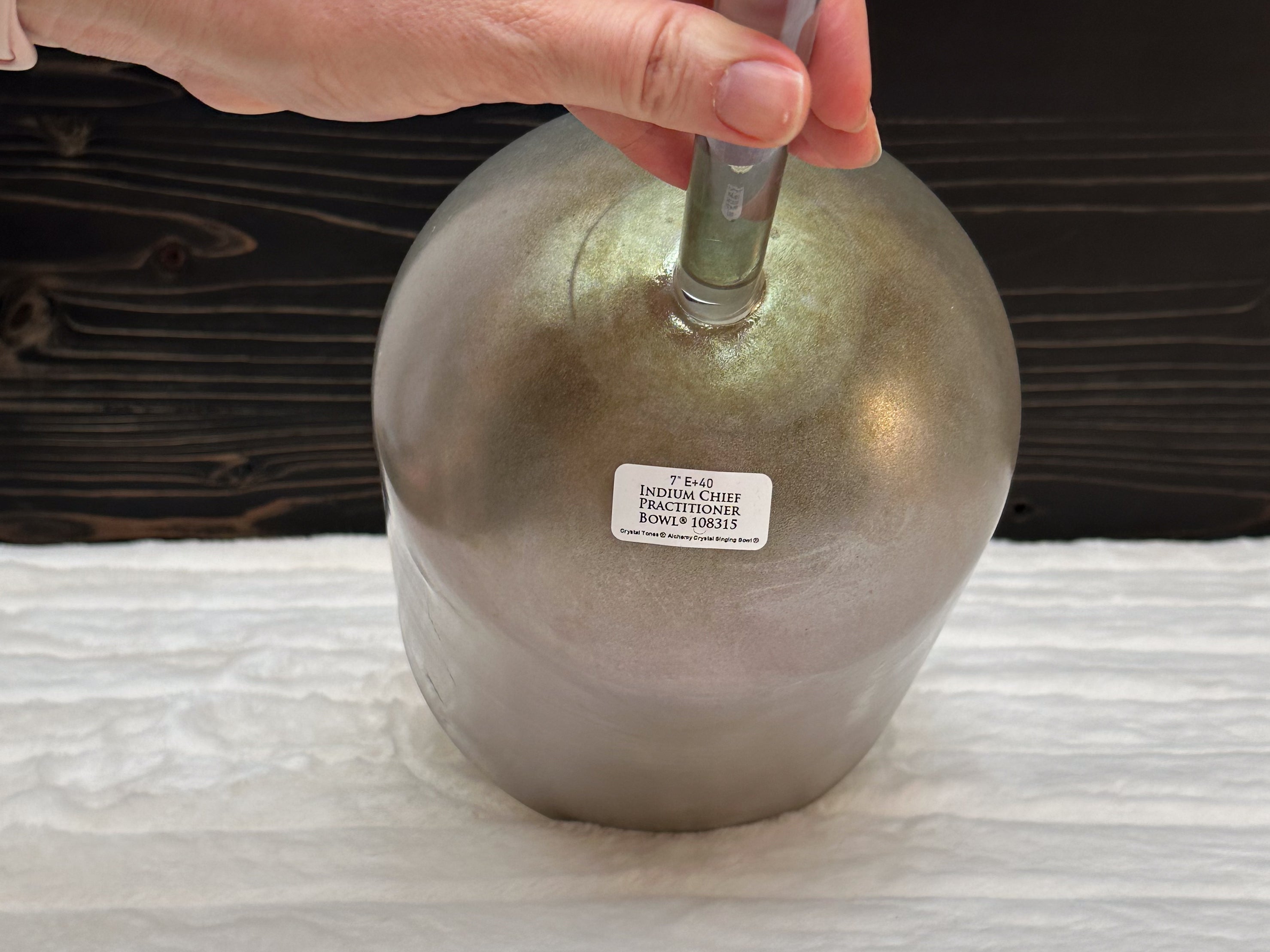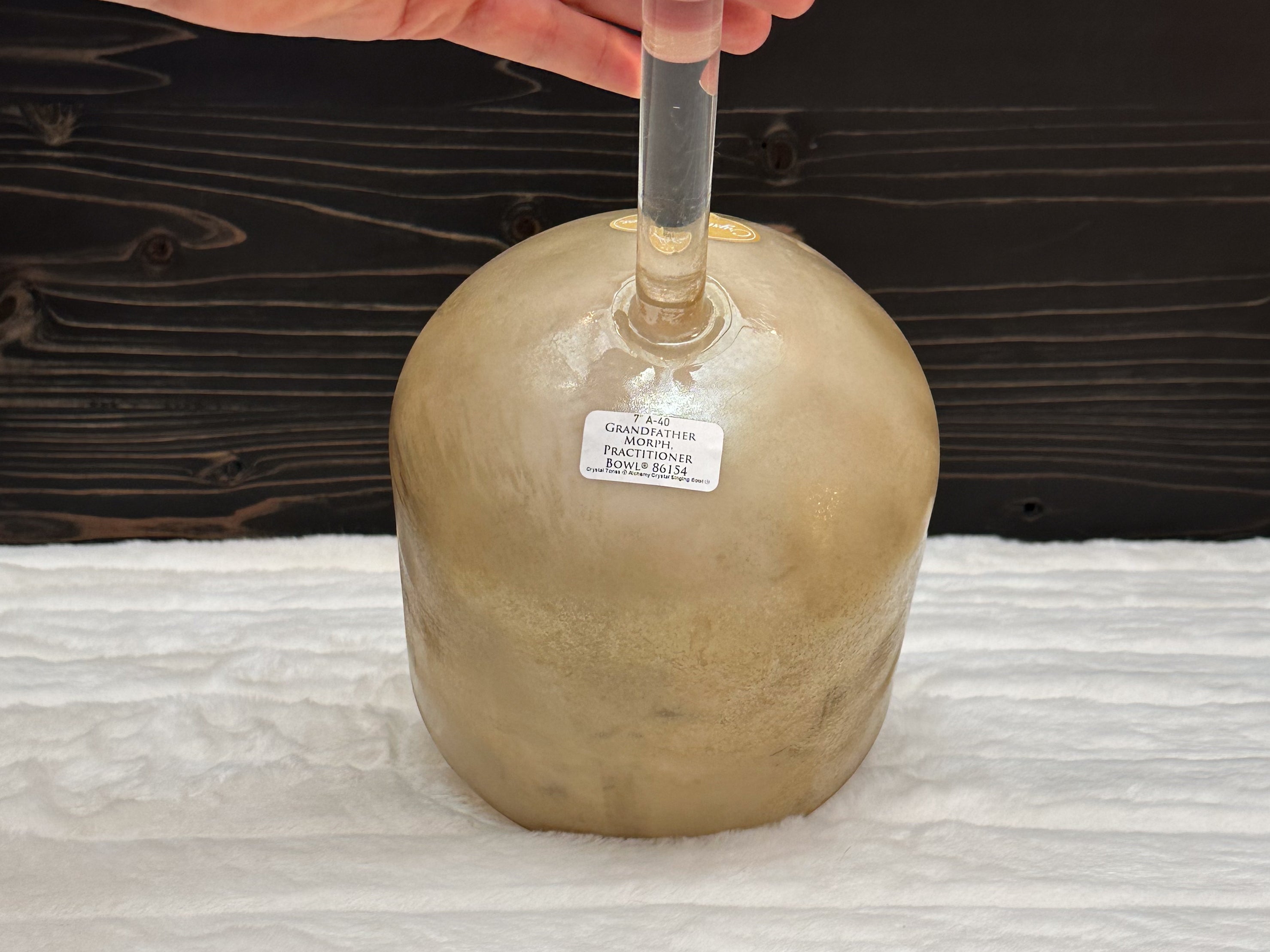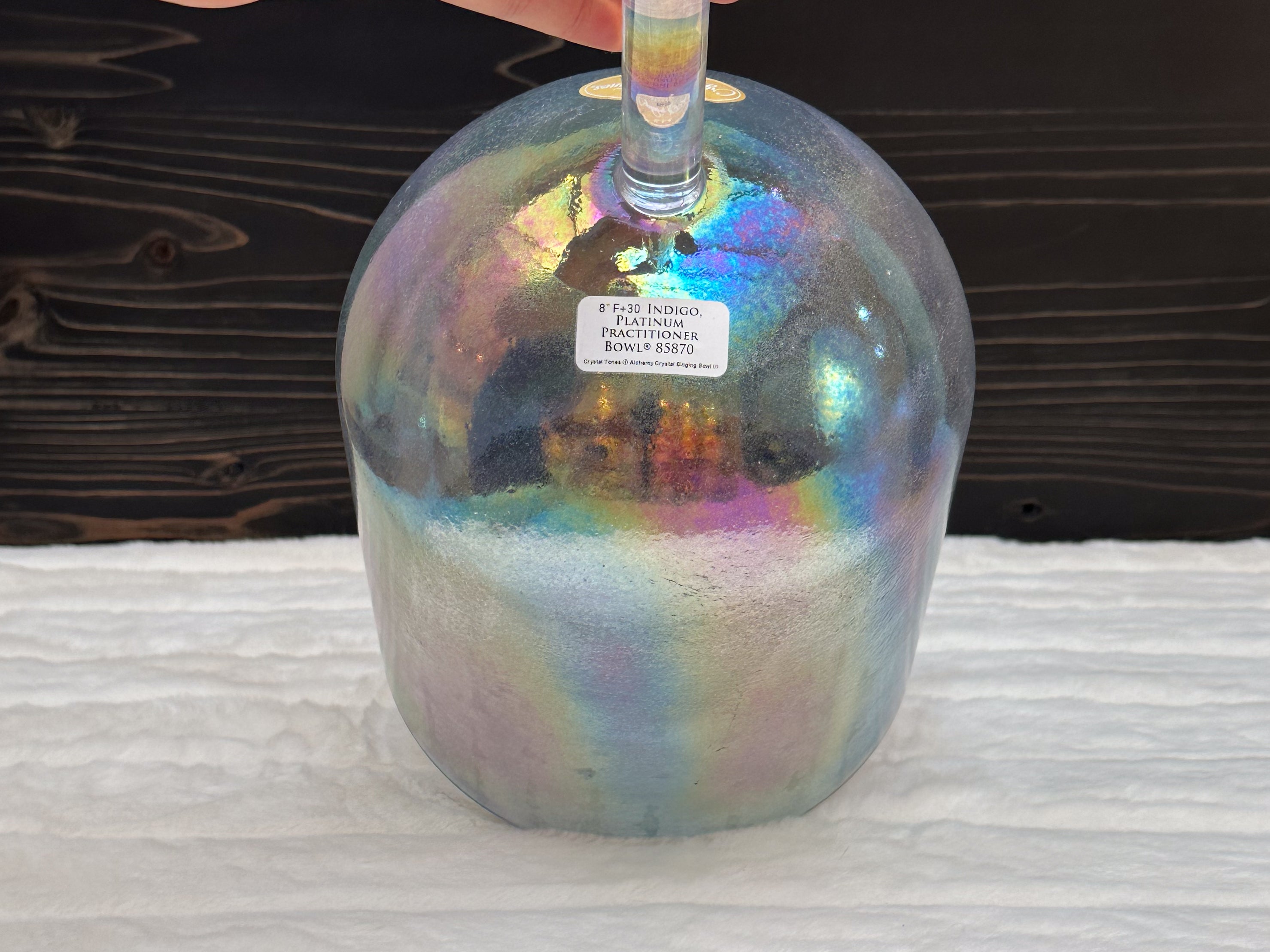 A Crystal Tones Practitioner Bowl is a handheld alchemy crystal singing bowl designed specifically for directed, intentional energy work. Unlike larger bowls that rest on the floor or a stand, practitioner bowls have a sturdy handle fused directly to the bowl, allowing the practitioner to walk around the room, work over the body, and deliver focused vibrational therapy with precision.