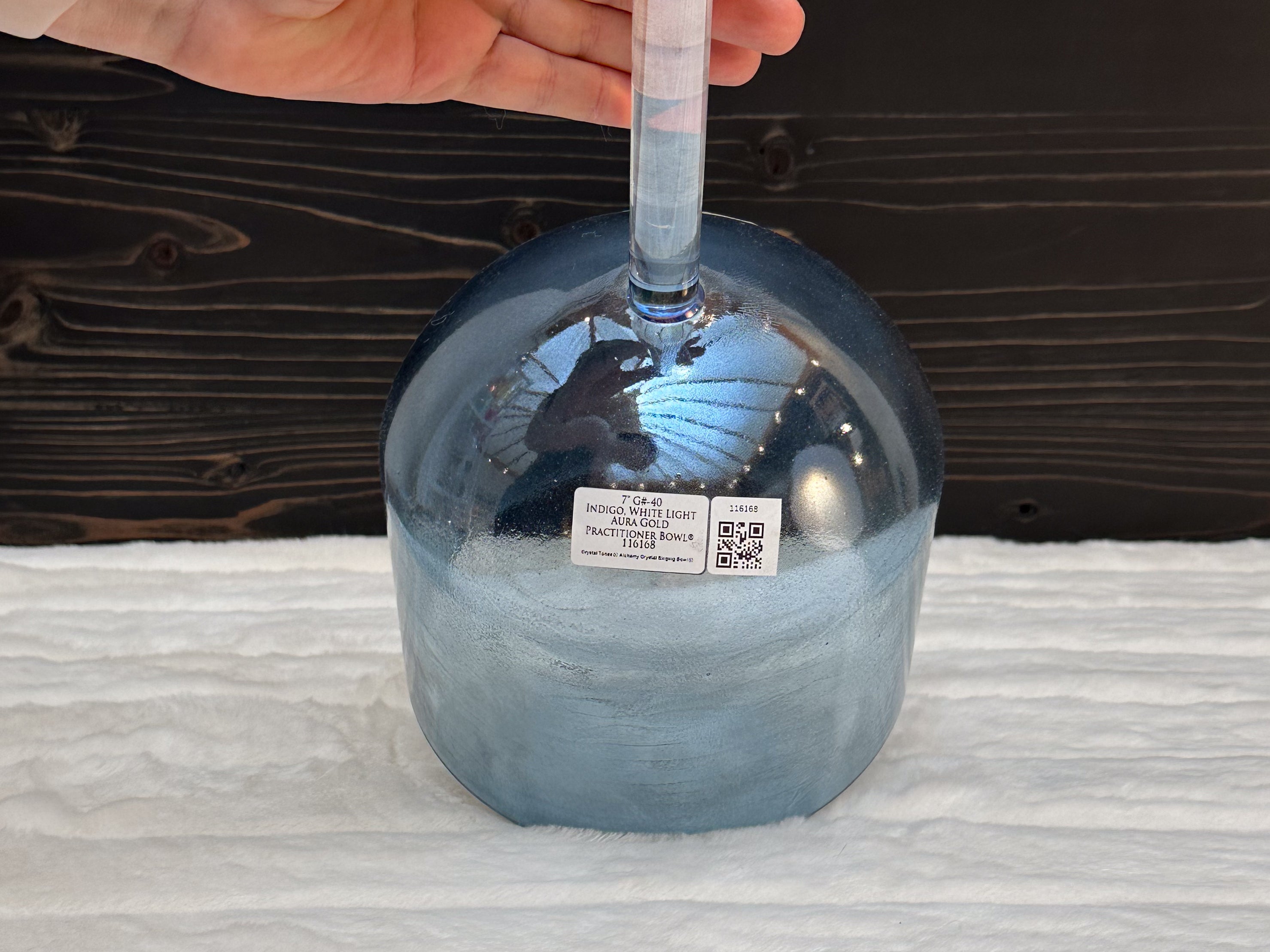 This bowl plays a G# note, which is said to align with the main endocrine system support (thyroid, pineal, pituitary), anchoring light into the brain.