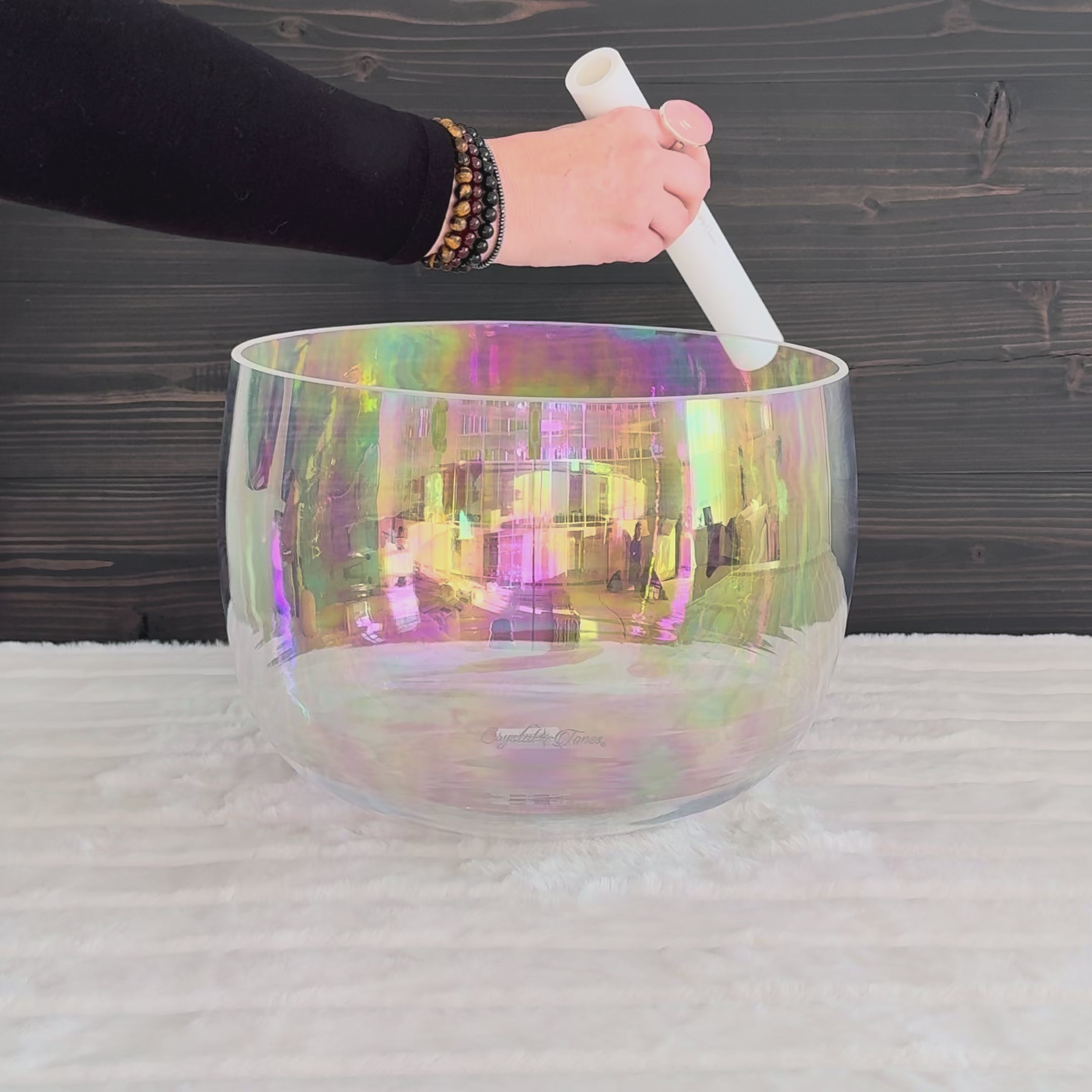 Crystal Tones® Alchemy Crystal Singing Bowls® are the most elegant, ethereal crystal singing bowls on the market. They are smaller and lighter than the more conventional frosted white crystal singing bowls with their 99.995% pure crystal structure infused with other precious gemstones, metals, and minerals. Their patented fusion technology that allows them to meld these elements together not only enhances the inherent energetic properties of the crystal singing bowls, but also adds an additional beauty and unique artistry that is like no other crystal singing bowls you can find elsewhere.