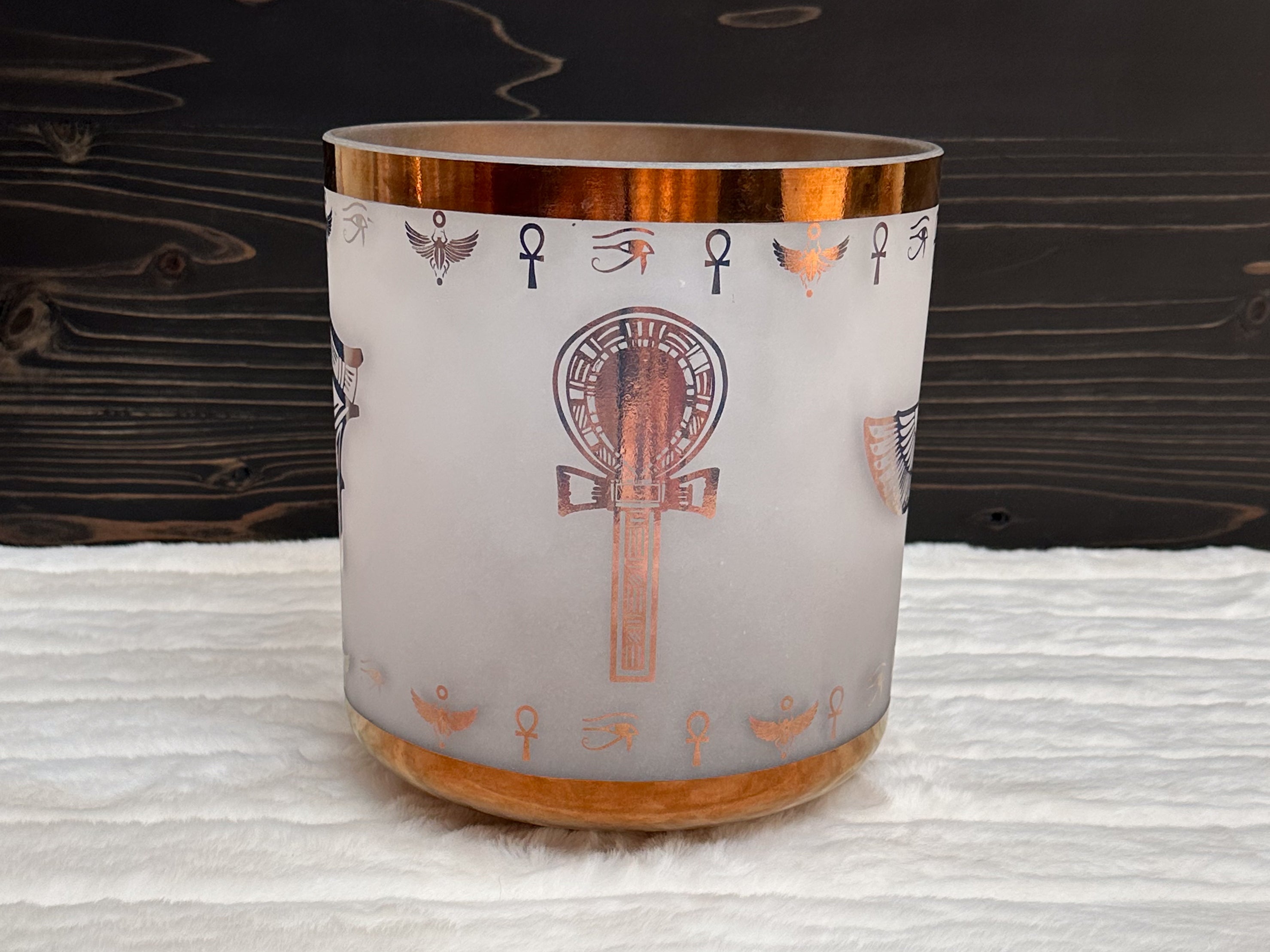 8" C+35 Tibetan Quartz Copper w/Etched Isis, Eye of Horus and Ankh Frosted Inside Crystal Tones® Alchemy Singing Bowl